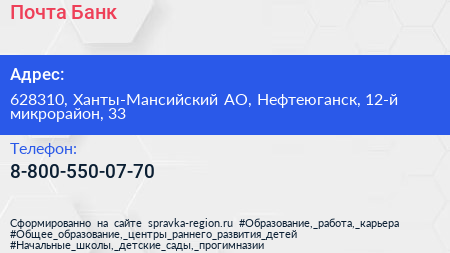 Почта Банк по адресу 628310, Ханты-Мансийский АО, Нефтеюганск, 12-й микрорайон, 33 в дальнейшем Организация, размещена в следующих категориях:
