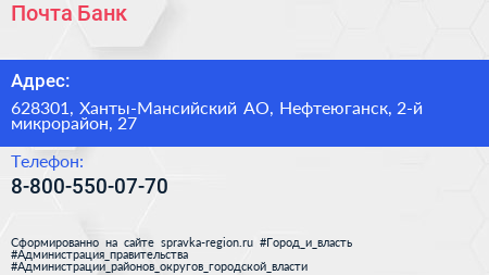 Почта Банк по адресу 628301, Ханты-Мансийский АО, Нефтеюганск, 2-й микрорайон, 27 в дальнейшем Организация, размещена в следующих категориях:
