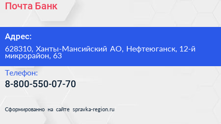 Почта Банк по адресу 628310, Ханты-Мансийский АО, Нефтеюганск, 12-й микрорайон, 63 в дальнейшем Организация, размещена в следующих категориях: