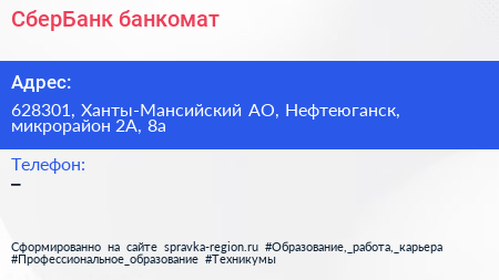 СберБанк, банкомат по адресу 628301, Ханты-Мансийский АО, Нефтеюганск, микрорайон 2А, 8а в дальнейшем Организация, размещена в следующих категориях: