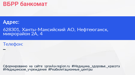 ВБРР, банкомат по адресу 628301, Ханты-Мансийский АО, Нефтеюганск, микрорайон 2А, 4 в дальнейшем Организация, размещена в следующих категориях: