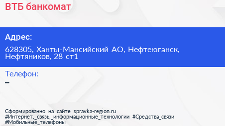 ВТБ, банкомат по адресу 628305, Ханты-Мансийский АО, Нефтеюганск, Нефтяников, 28 ст1 в дальнейшем Организация, размещена в следующих категориях:
