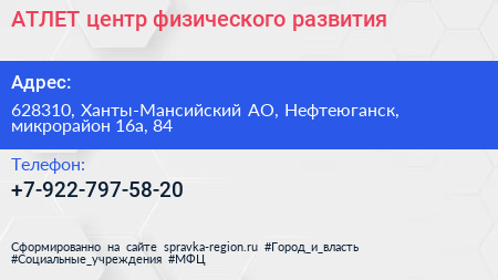 АТЛЕТ, центр физического развития по адресу 628310, Ханты-Мансийский АО, Нефтеюганск, микрорайон 16а, 84 в дальнейшем Организация, размещена в следующих категориях: