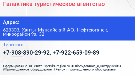 Галактика, туристическое агентство по адресу 628303, Ханты-Мансийский АО, Нефтеюганск, микрорайон 9а, 32 в дальнейшем Организация, размещена в следующих категориях: