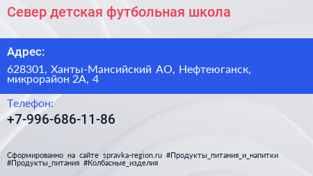 Север, детская футбольная школа по адресу 628301, Ханты-Мансийский АО, Нефтеюганск, микрорайон 2А, 4 в дальнейшем Организация, размещена в следующих категориях: