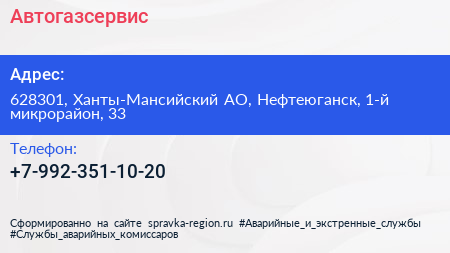 Автогазсервис по адресу 628301, Ханты-Мансийский АО, Нефтеюганск, 1-й микрорайон, 33 в дальнейшем Организация, размещена в следующих категориях: