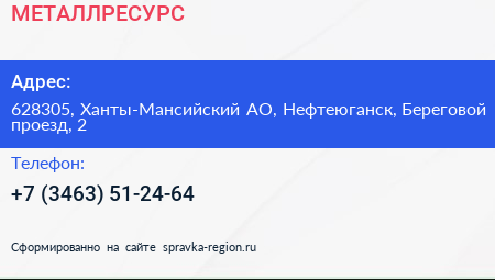 МЕТАЛЛРЕСУРС по адресу 628305, Ханты-Мансийский АО, Нефтеюганск, Береговой проезд, 2 в дальнейшем Организация, размещена в следующих категориях: