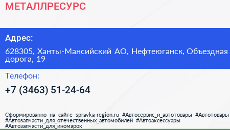 МЕТАЛЛРЕСУРС по адресу 628305, Ханты-Мансийский АО, Нефтеюганск, Объездная дорога, 19 в дальнейшем Организация, размещена в следующих категориях: