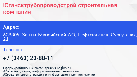 Югансктрубопроводстрой, строительная компания по адресу 628305, Ханты-Мансийский АО, Нефтеюганск, Сургутская, 21 в дальнейшем Организация, размещена в следующих категориях: