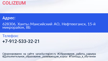 COLIZEUM по адресу 628306, Ханты-Мансийский АО, Нефтеюганск, 15-й микрорайон, 8Б в дальнейшем Организация, размещена в следующих категориях: