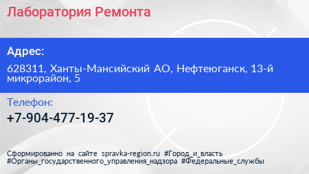 Лаборатория Ремонта по адресу 628311, Ханты-Мансийский АО, Нефтеюганск, 13-й микрорайон, 5 в дальнейшем Организация, размещена в следующих категориях: