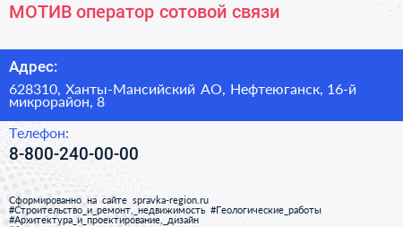 МОТИВ, оператор сотовой связи по адресу 628310, Ханты-Мансийский АО, Нефтеюганск, 16-й микрорайон, 8 в дальнейшем Организация, размещена в следующих категориях: