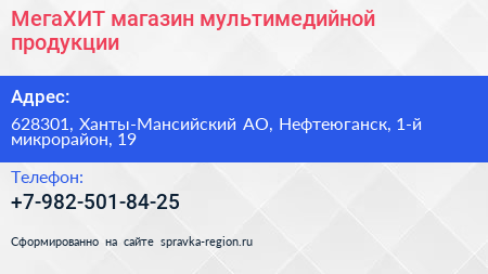 МегаХИТ, магазин мультимедийной продукции по адресу 628301, Ханты-Мансийский АО, Нефтеюганск, 1-й микрорайон, 19 в дальнейшем Организация, размещена в следующих категориях:
