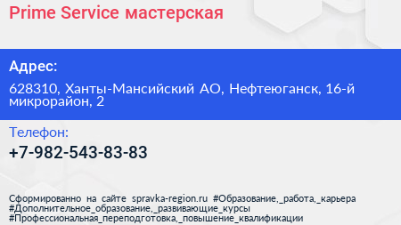 Prime Service, мастерская по адресу 628310, Ханты-Мансийский АО, Нефтеюганск, 16-й микрорайон, 2 в дальнейшем Организация, размещена в следующих категориях: