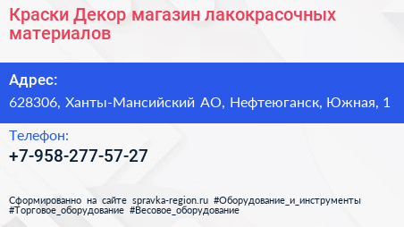 Краски Декор, магазин лакокрасочных материалов по адресу 628306, Ханты-Мансийский АО, Нефтеюганск, Южная, 1 в дальнейшем Организация, размещена в следующих категориях: