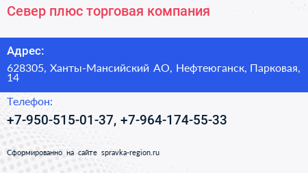 Север плюс, торговая компания по адресу 628305, Ханты-Мансийский АО, Нефтеюганск, Парковая, 14 в дальнейшем Организация, размещена в следующих категориях: