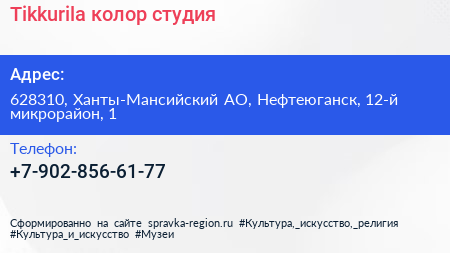 Tikkurila, колор-студия по адресу 628310, Ханты-Мансийский АО, Нефтеюганск, 12-й микрорайон, 1 в дальнейшем Организация, размещена в следующих категориях: