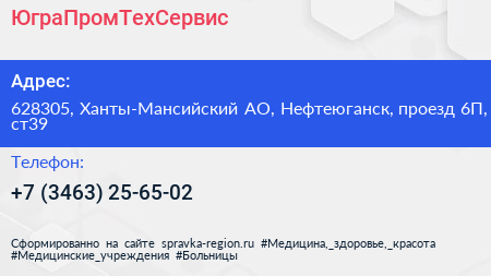 ЮграПромТехСервис по адресу 628305, Ханты-Мансийский АО, Нефтеюганск, проезд 6П, ст39 в дальнейшем Организация, размещена в следующих категориях: