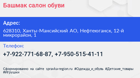 Башмак, салон обуви по адресу 628310, Ханты-Мансийский АО, Нефтеюганск, 12-й микрорайон, 1 в дальнейшем Организация, размещена в следующих категориях: