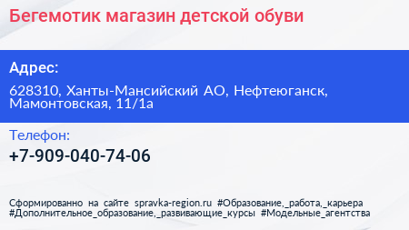 Бегемотик, магазин детской обуви по адресу 628310, Ханты-Мансийский АО, Нефтеюганск, Мамонтовская, 11/1а в дальнейшем Организация, размещена в следующих категориях: