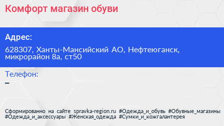 Комфорт, магазин обуви по адресу 628307, Ханты-Мансийский АО, Нефтеюганск, микрорайон 8а, ст50 в дальнейшем Организация, размещена в следующих категориях:
