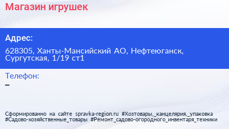 Магазин игрушек по адресу 628305, Ханты-Мансийский АО, Нефтеюганск, Сургутская, 1/19 ст1 в дальнейшем Организация, размещена в следующих категориях: