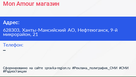 Mon Amour, магазин по адресу 628303, Ханты-Мансийский АО, Нефтеюганск, 9-й микрорайон, 21 в дальнейшем Организация, размещена в следующих категориях: