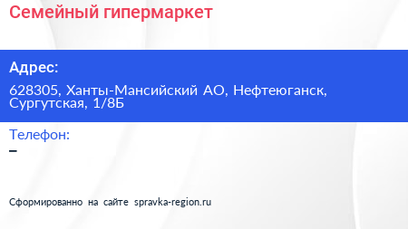Семейный, гипермаркет по адресу 628305, Ханты-Мансийский АО, Нефтеюганск, Сургутская, 1/8Б в дальнейшем Организация, размещена в следующих категориях: