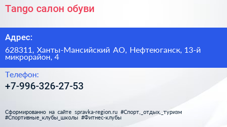 Tango, салон обуви по адресу 628311, Ханты-Мансийский АО, Нефтеюганск, 13-й микрорайон, 4 в дальнейшем Организация, размещена в следующих категориях:
