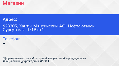 Магазин по адресу 628305, Ханты-Мансийский АО, Нефтеюганск, Сургутская, 1/19 ст1 в дальнейшем Организация, размещена в следующих категориях: