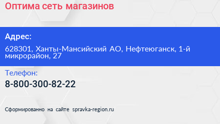 Оптима, сеть магазинов по адресу 628301, Ханты-Мансийский АО, Нефтеюганск, 1-й микрорайон, 27 в дальнейшем Организация, размещена в следующих категориях:
