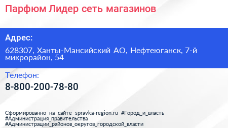 Парфюм-Лидер, сеть магазинов по адресу 628307, Ханты-Мансийский АО, Нефтеюганск, 7-й микрорайон, 54 в дальнейшем Организация, размещена в следующих категориях:
