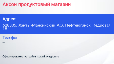 Аксон, продуктовый магазин по адресу 628305, Ханты-Мансийский АО, Нефтеюганск, Кедровая, 18 в дальнейшем Организация, размещена в следующих категориях: