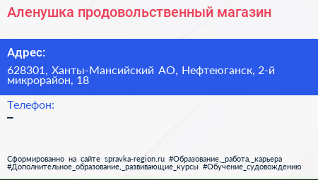 Аленушка, продовольственный магазин по адресу 628301, Ханты-Мансийский АО, Нефтеюганск, 2-й микрорайон, 18 в дальнейшем Организация, размещена в следующих категориях: