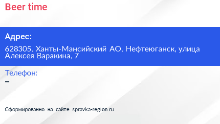 Beer time по адресу 628305, Ханты-Мансийский АО, Нефтеюганск, улица Алексея Варакина, 7 в дальнейшем Организация, размещена в следующих категориях:
