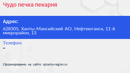 Чудо печка, пекарня по адресу 628305, Ханты-Мансийский АО, Нефтеюганск, 11-й микрорайон, 13 в дальнейшем Организация, размещена в следующих категориях: