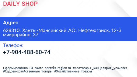 DAILY SHOP по адресу 628310, Ханты-Мансийский АО, Нефтеюганск, 12-й микрорайон, 37 в дальнейшем Организация, размещена в следующих категориях: