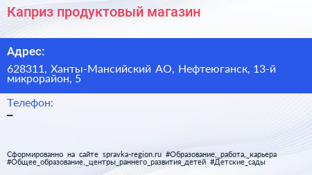 Каприз, продуктовый магазин по адресу 628311, Ханты-Мансийский АО, Нефтеюганск, 13-й микрорайон, 5 в дальнейшем Организация, размещена в следующих категориях: