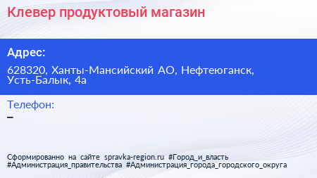 Клевер, продуктовый магазин по адресу 628320, Ханты-Мансийский АО, Нефтеюганск, Усть-Балык, 4а в дальнейшем Организация, размещена в следующих категориях: