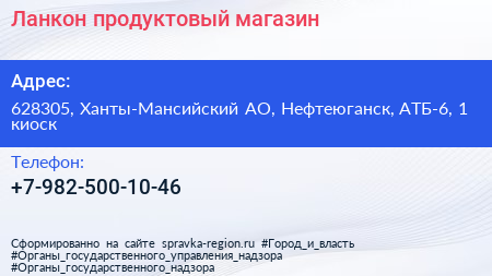 Ланкон, продуктовый магазин по адресу 628305, Ханты-Мансийский АО, Нефтеюганск, АТБ-6, 1 киоск в дальнейшем Организация, размещена в следующих категориях: