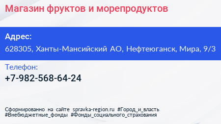 Магазин фруктов и морепродуктов по адресу 628305, Ханты-Мансийский АО, Нефтеюганск, Мира, 9/3 в дальнейшем Организация, размещена в следующих категориях: