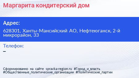Маргарита, кондитерский дом по адресу 628301, Ханты-Мансийский АО, Нефтеюганск, 2-й микрорайон, 33 в дальнейшем Организация, размещена в следующих категориях: