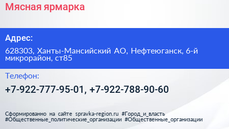 Мясная ярмарка по адресу 628303, Ханты-Мансийский АО, Нефтеюганск, 6-й микрорайон, ст85 в дальнейшем Организация, размещена в следующих категориях: