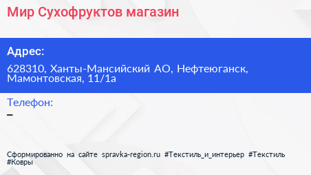 Мир Сухофруктов, магазин по адресу 628310, Ханты-Мансийский АО, Нефтеюганск, Мамонтовская, 11/1а в дальнейшем Организация, размещена в следующих категориях: