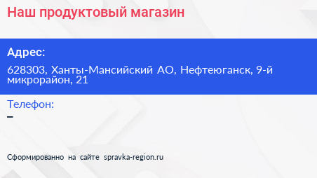 Наш, продуктовый магазин по адресу 628303, Ханты-Мансийский АО, Нефтеюганск, 9-й микрорайон, 21 в дальнейшем Организация, размещена в следующих категориях: