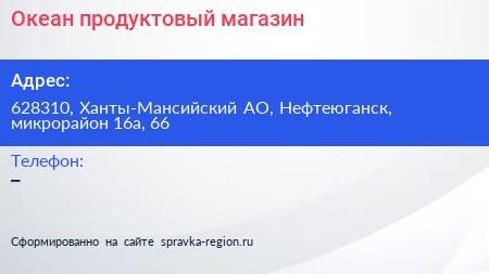 Океан, продуктовый магазин по адресу 628310, Ханты-Мансийский АО, Нефтеюганск, микрорайон 16а, 66 в дальнейшем Организация, размещена в следующих категориях: