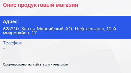 Онис, продуктовый магазин по адресу 628310, Ханты-Мансийский АО, Нефтеюганск, 12-й микрорайон, 17 в дальнейшем Организация, размещена в следующих категориях: