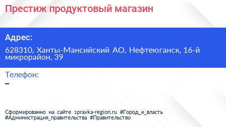 Престиж, продуктовый магазин по адресу 628310, Ханты-Мансийский АО, Нефтеюганск, 16-й микрорайон, 39 в дальнейшем Организация, размещена в следующих категориях: