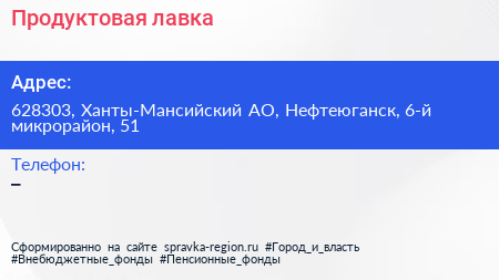 Продуктовая лавка по адресу 628303, Ханты-Мансийский АО, Нефтеюганск, 6-й микрорайон, 51 в дальнейшем Организация, размещена в следующих категориях: