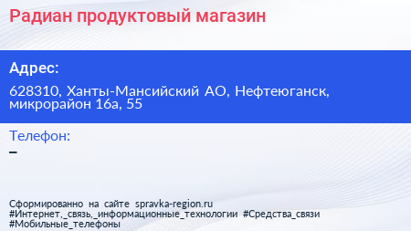 Радиан, продуктовый магазин по адресу 628310, Ханты-Мансийский АО, Нефтеюганск, микрорайон 16а, 55 в дальнейшем Организация, размещена в следующих категориях: